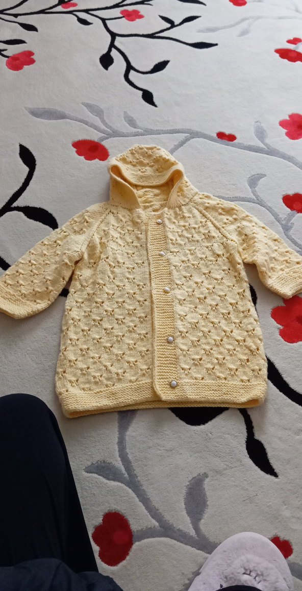 Hafif sarı, uzun kollu, bohem tarzda, düğmeli kız hırkası. Örgü dokusu ve bol kesimiyle rahat bir kullanıma sahiptir.