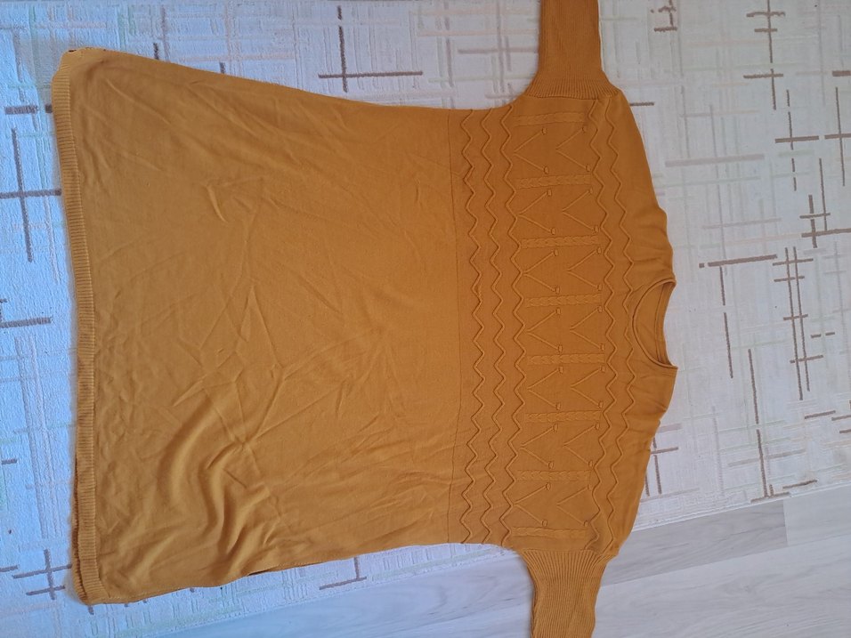 Sarı renkli, örme dokulu, yuvarlak yakalı ve uzun kollu kadın kazak. Bol kesim ve midi boyda, rahat bohem tarzıyla gündelik kullanıma uygun.