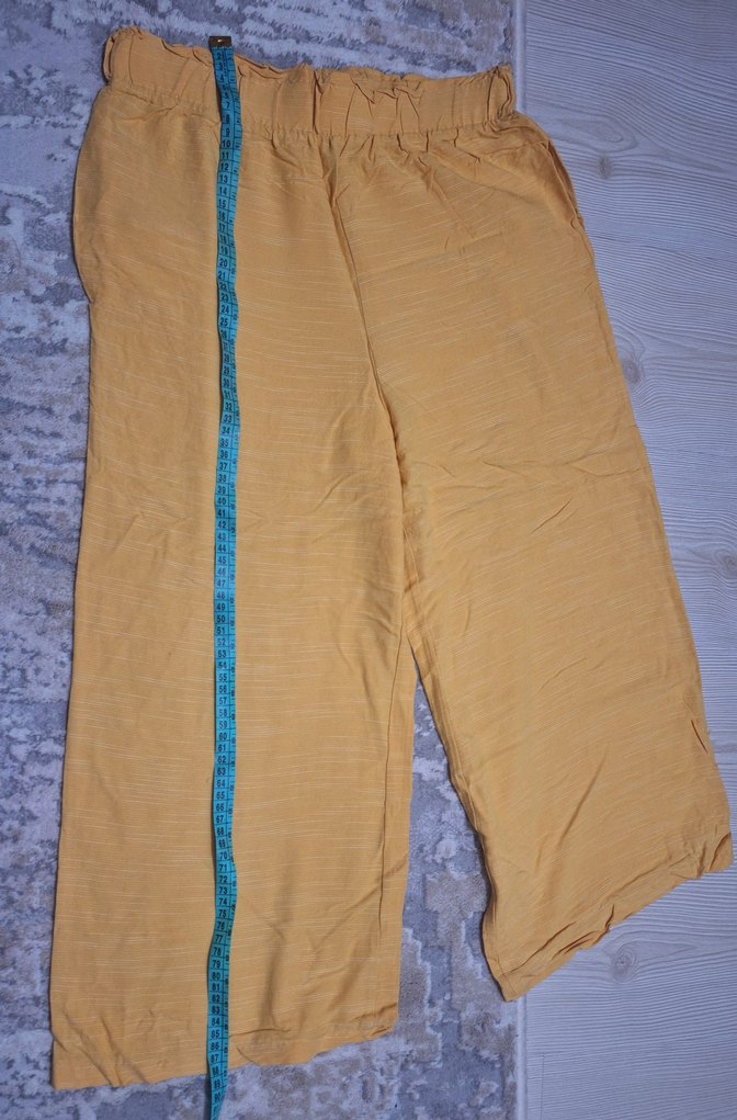 Sarı keten kumaştan, salaş kesimli ve drapeli midi boy kadın pantolon. Bohem tarzıyla günlük kullanıma uygun rahat bir model.