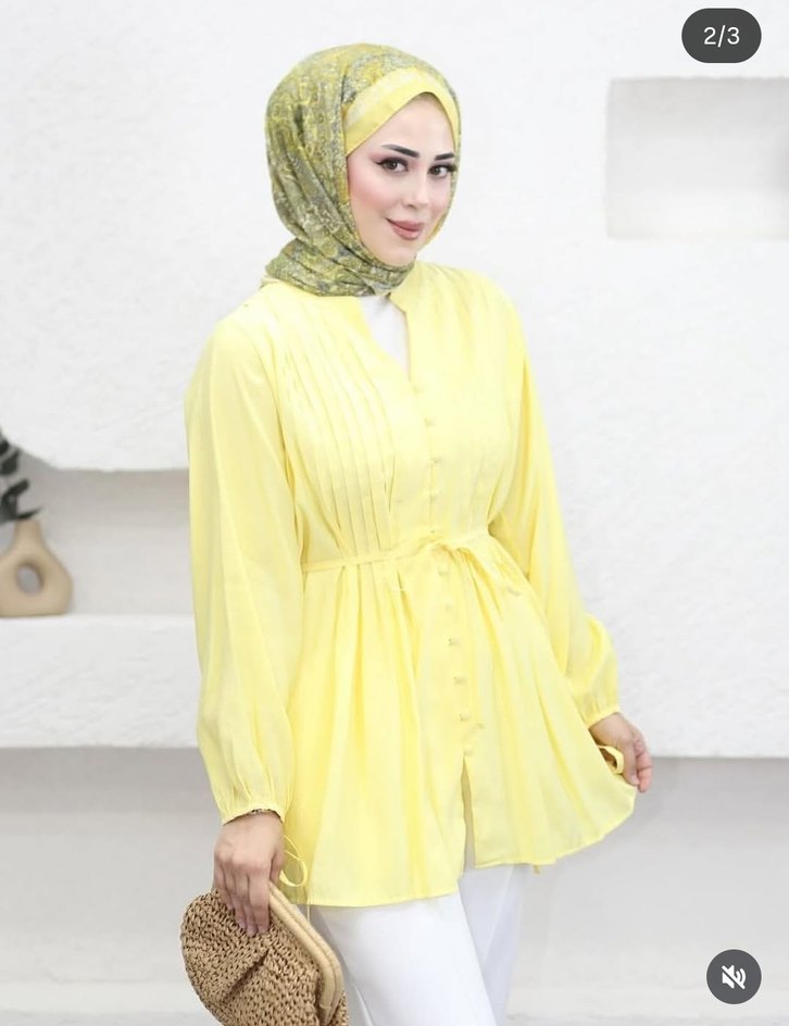 Yüksek yakalı, salaş kesim sarı tunik, uzun kollu ve drapeli, hafif batik desenli, günlük kullanıma uygun.
