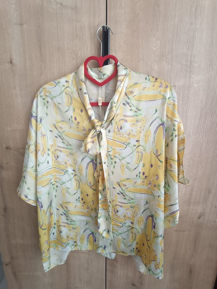 Salaş kesim, sarı mini gömlek. Halter yaka ve kısa kollu, pastel batik desenli, ipeksi ve drapeli dokuda, bohem tarzına uygun.
