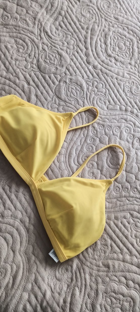 Pastel sarı renkte, ince askılı ve desensiz bohem tarzı bikini üstü.44 beden üst xl beden alt LCW& DeFacto