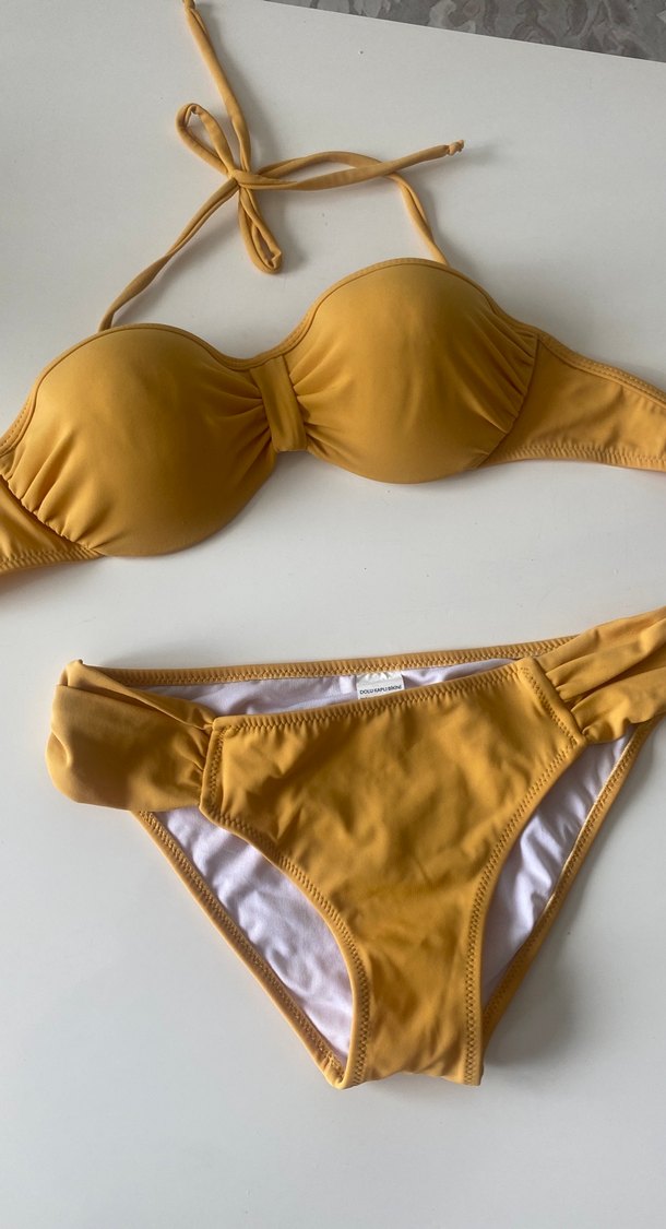 Sarı renkli, askılı ve vücuda oturan kadın bikini. Parlak ve minimal tasarımıyla plajda bohem stilini yansıtıyor. Rahat ve şık bir görünüm sunar. ️Xs giyiyorum ama s bedene de uygun 1 kere giydim