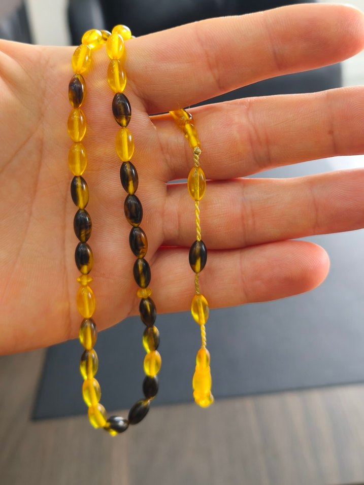Erkekler için koyu sarı renkte, bohem tarzda ve minimalist tasarımlı tesbih seti.