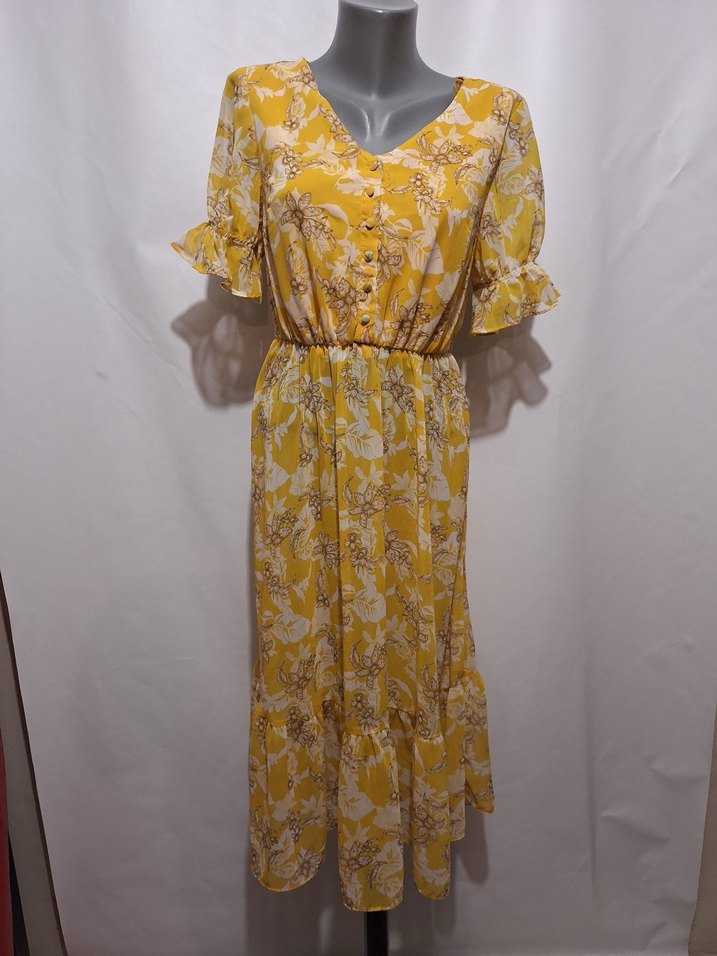 Sarı Bohem Uzun Elbise, Düğmeli, V Yaka