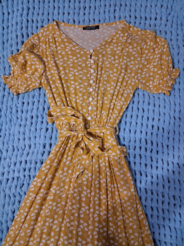 Bu uzun sarı elbise, bol kesim, yırtmaçlı, V yaka ve düğmeli ön detayına sahiptir. Kısa kollu, bel bağlamalı.