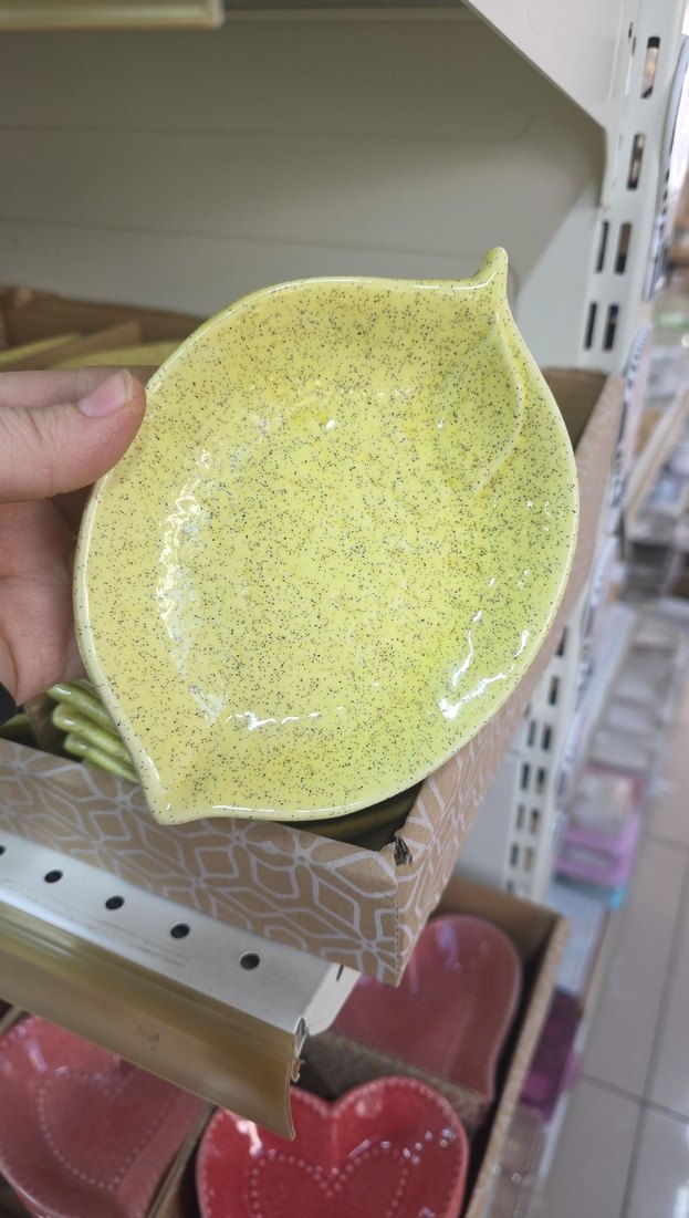 Hafif sarı renkte, yaprak şeklinde ve hafif benekli, parlak yüzeyli bohem tarzda tabak. ️1 adet 25₺