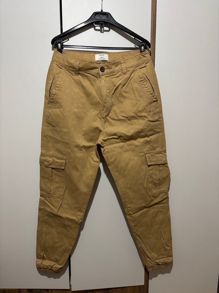Sentetik kumaştan yapılmış, kemerli ve midi boy bol kesim bej erkek kargo pantolon. Outdoor için uygun rahat stil.