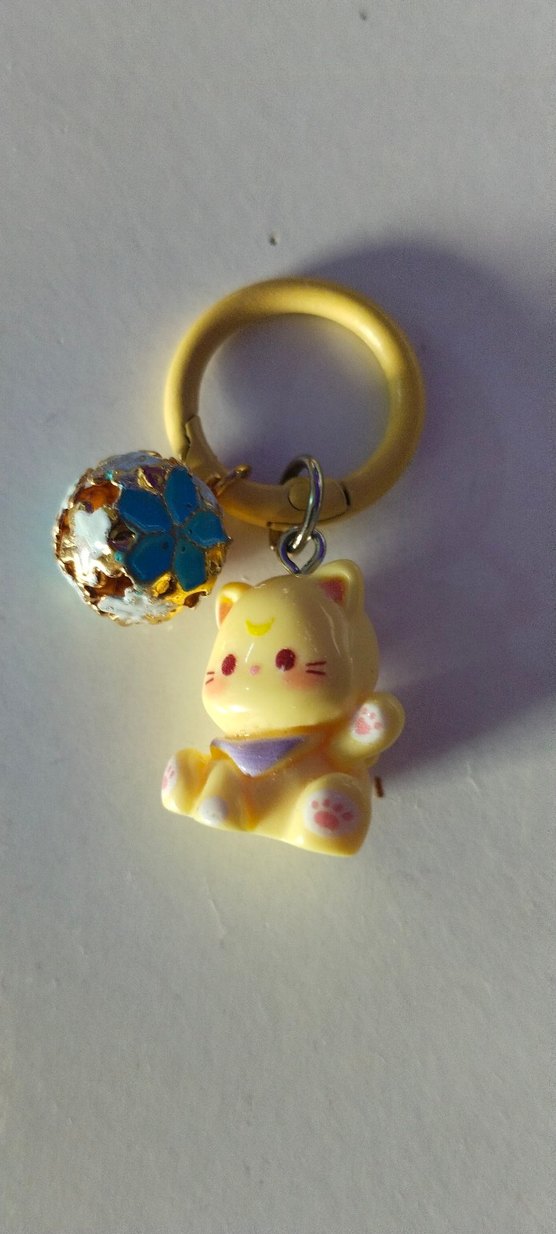 Sarı renkte, boncuklu ve renkli bir süslemeye sahip, küçük kedi figürlü bohem ve minimalist tarzda anahtarlık.