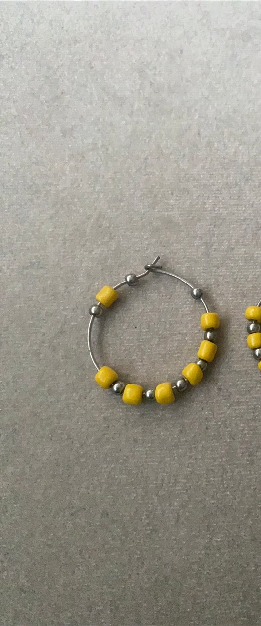 Sarı boncuklar ve küçük gümüş detaylarla süslenmiş bohem tarzda halka küpelerdir. Günlük kullanım için uygundur.