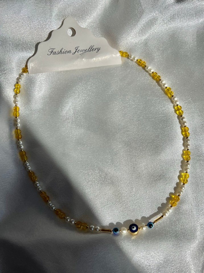 Hafif sarı boncuklardan yapılmış, işlemeli desenli ve nazar boncuğu detaylı bohem tarzda kadın kolye. ✨