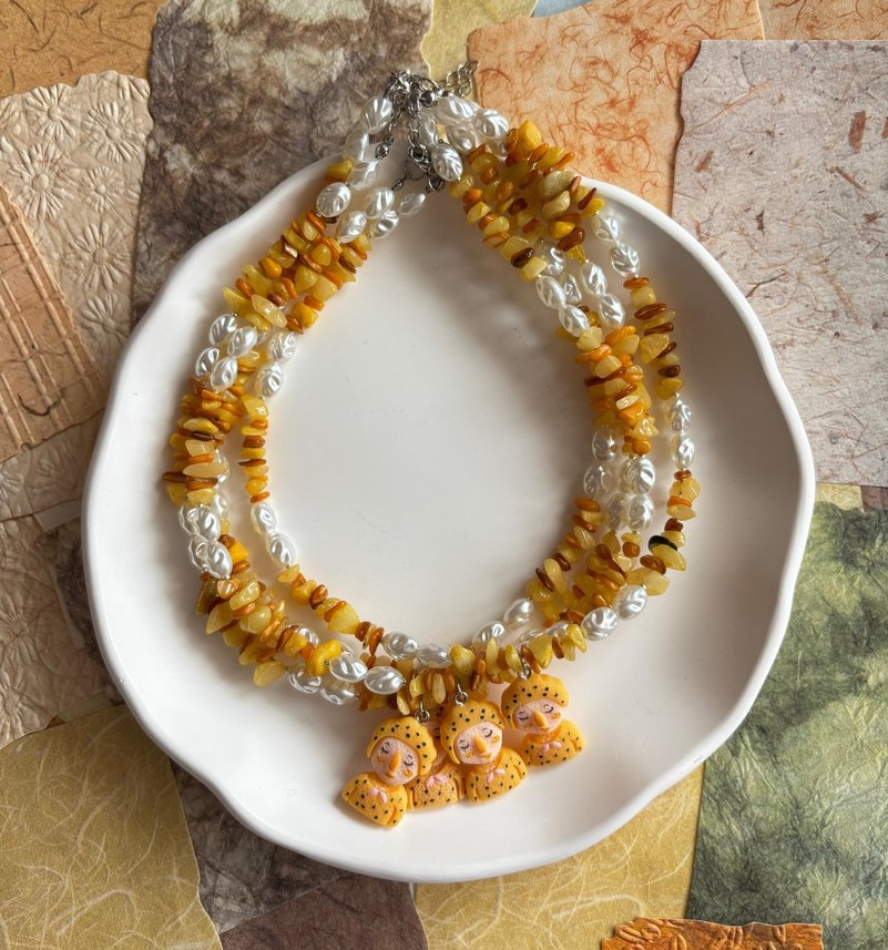 Sarı boncuklar ve nakış detaylarıyla bohem tarzda midi uzunlukta kolye, günlük kullanıma uygun doğal dokunuşlu ve eğlenceli bir tasarım.