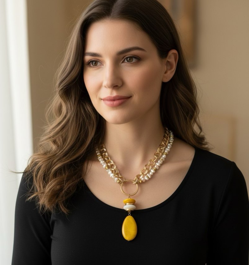 Sarı boncuklarla süslenmiş, bohem tarzda ve parlak etnik desenli midi uzunlukta kolye. Günlük kullanıma uygundur.
