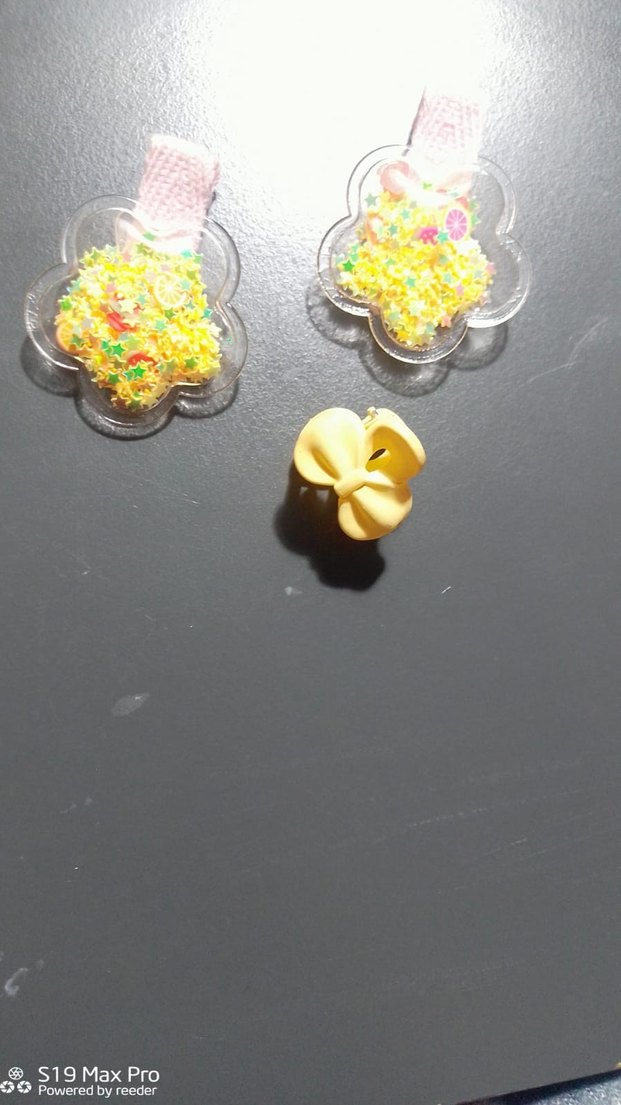 Sarı boncuklu çiçek desenli ve sade sarı fiyonk tokadan oluşan çocuk saç tokası seti.