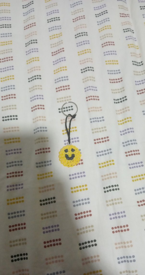 Renkli sarı boncuklardan yapılmış, gülümseyen yüz figürlü, bohem ve retro tarzı yansıtan minimalist anahtarlık.