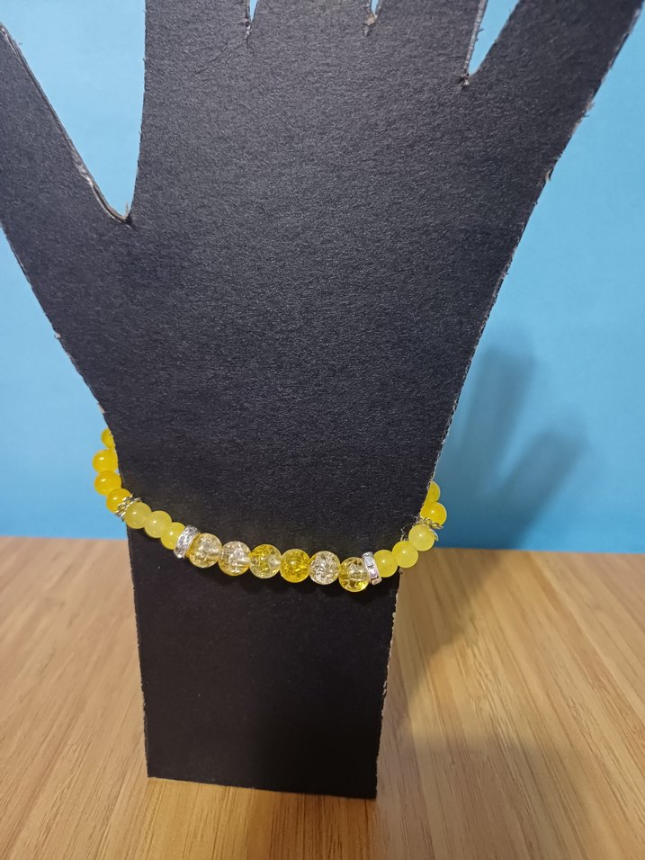 Sarı ve şeffaf boncuklardan oluşan minimalist tasarımlı kadın bileklik. Bohem ve retro tarzlarla günlük kullanıma uygundur.