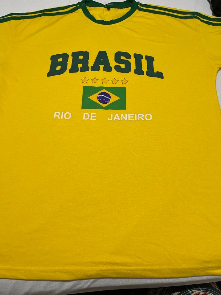 Sarı renk, kısa kollu, yuvarlak yakalı, bol kesim spor tişört. Brasil baskısı ve Rio de Janeiro yazısı ile sentetik kumaştan, cırt cırt detaylı.