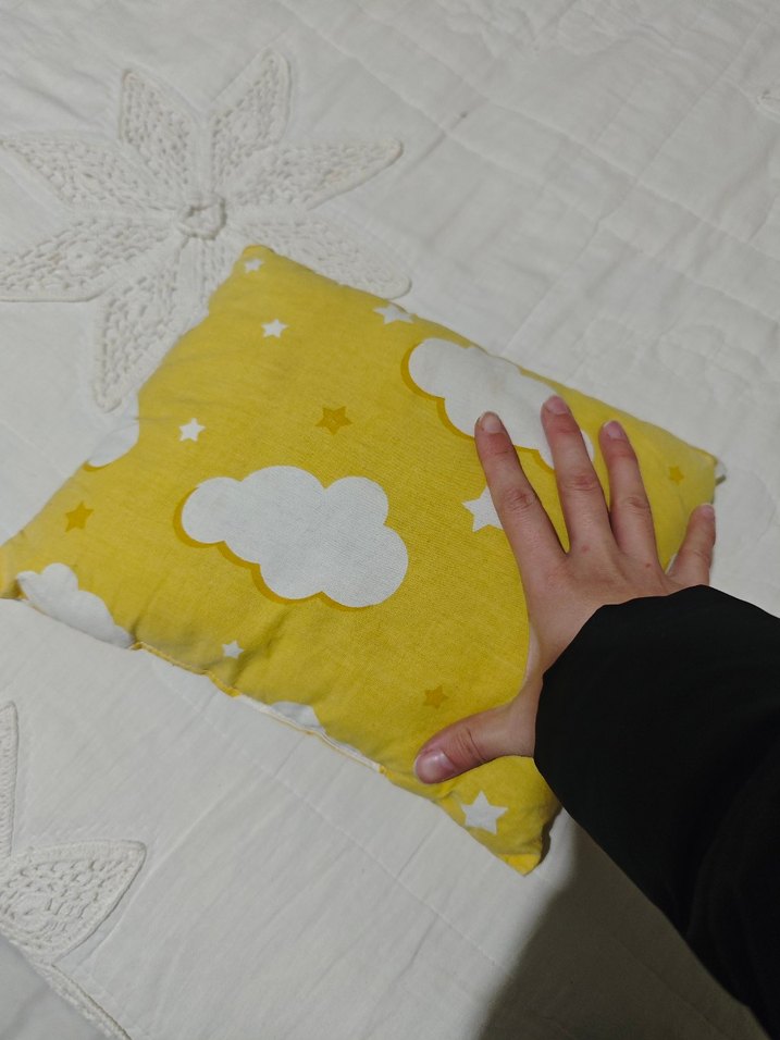 Pastel sarı renkli, bulut ve yıldız desenli yumuşak çocuk yastığıdır. Dikdörtgendir.