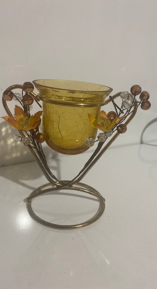 Çiçek ve boncuk detaylı metal çerçeveli açık sarı cam mumluk. Küçük mumlar için uygundur. ️