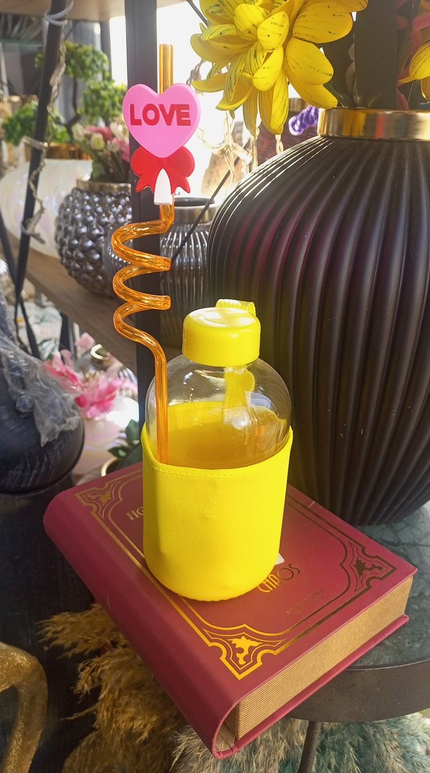 Renkli spiral pipet ve LOVE yazılı kalp süsü olan sarı Cam şişe .Sağlıklı cam termos