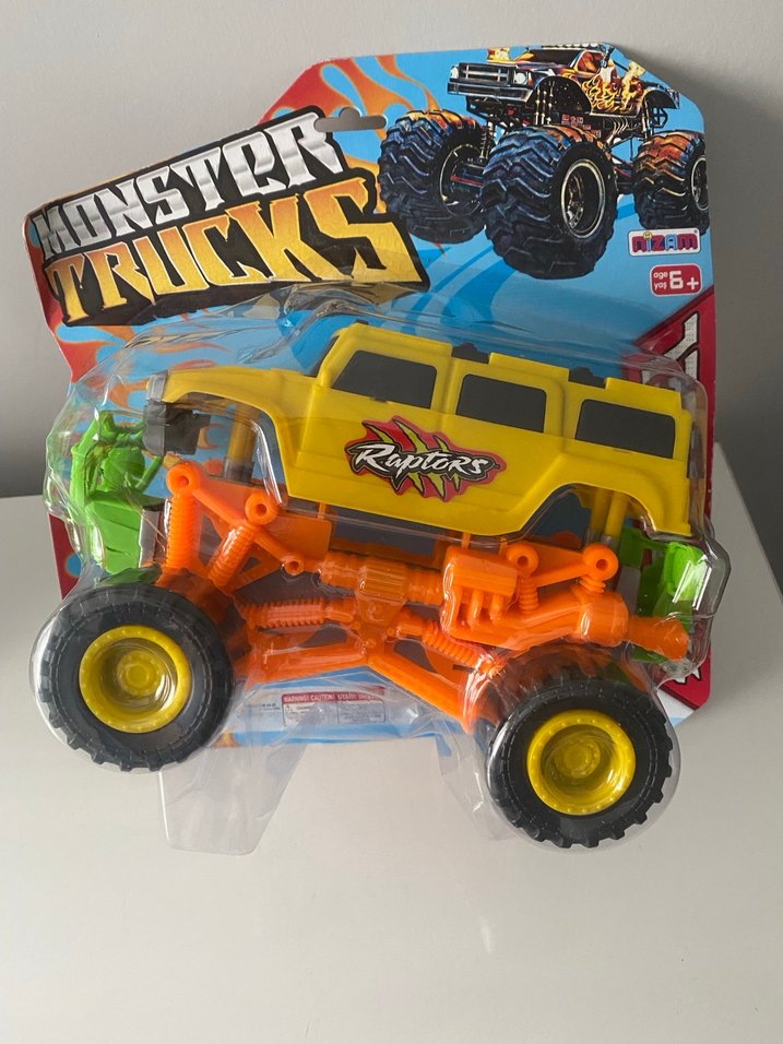 6 yaş ve üzeri çocuklar için renkli detaylara sahip sarı canavar kamyon oyuncak araba.