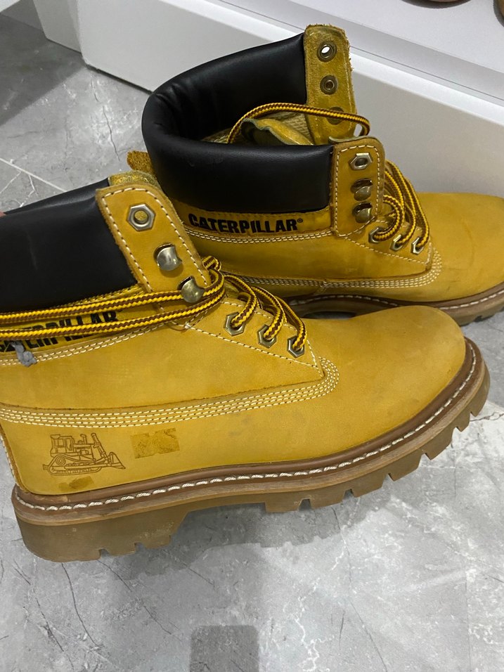 Sarı Caterpillar botlar, blok topuk ve bağcıklı tasarıma sahip. Dayanıklı kauçuk malzemeden üretilmiş, günlük sokak stili için uygun.