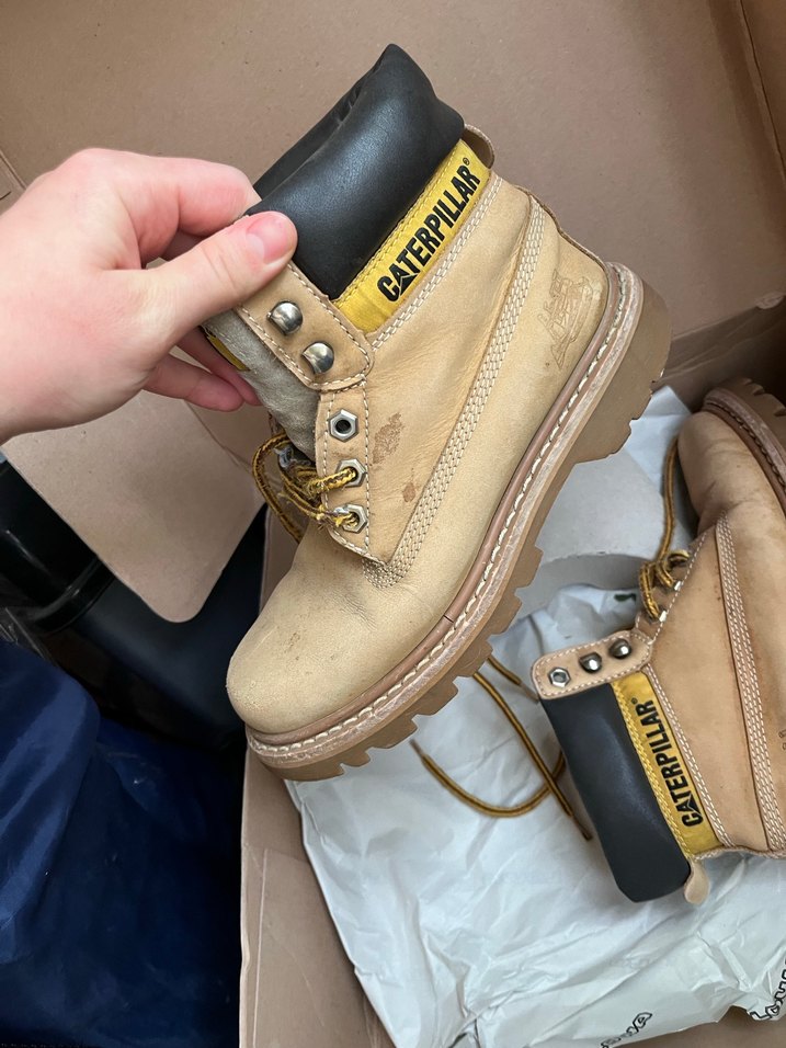 Sarı Caterpillar botlar, tokalı detaylara sahip, kauçuk malzemeden üretilmiş, sokak tarzı için uygun. Üzerinde lekeleri mevcut. Lostrada boyanırsa hiçbir sıkıntı yaratmaz.
