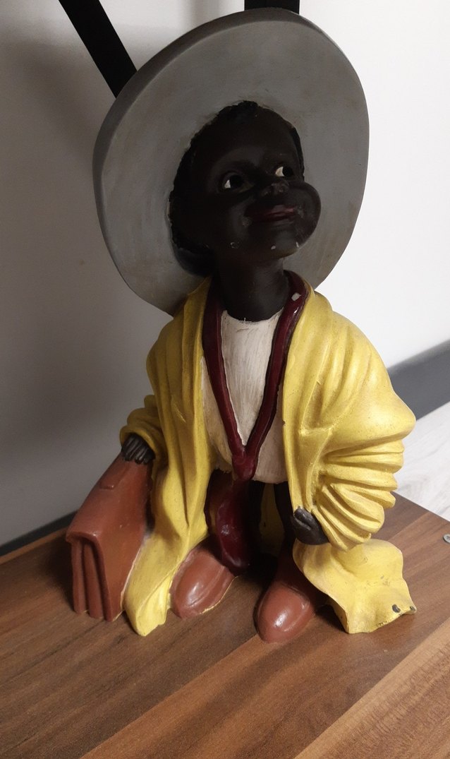 Sarı ceket giymiş koyu tenli figür, büyük şapka takıyor ve bir valiz tutuyor. Ahşap kaide üzerinde duruyor.