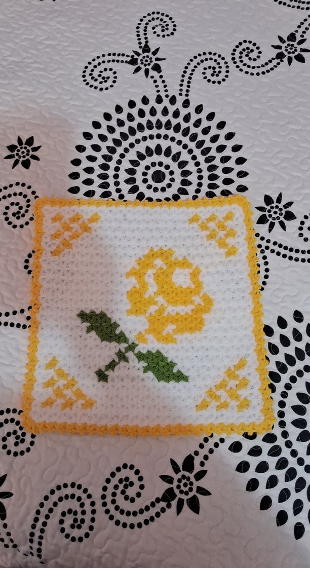 Sarı çiçek ve yeşil yaprak desenli, yumuşak dokulu örgü banyo lifi.