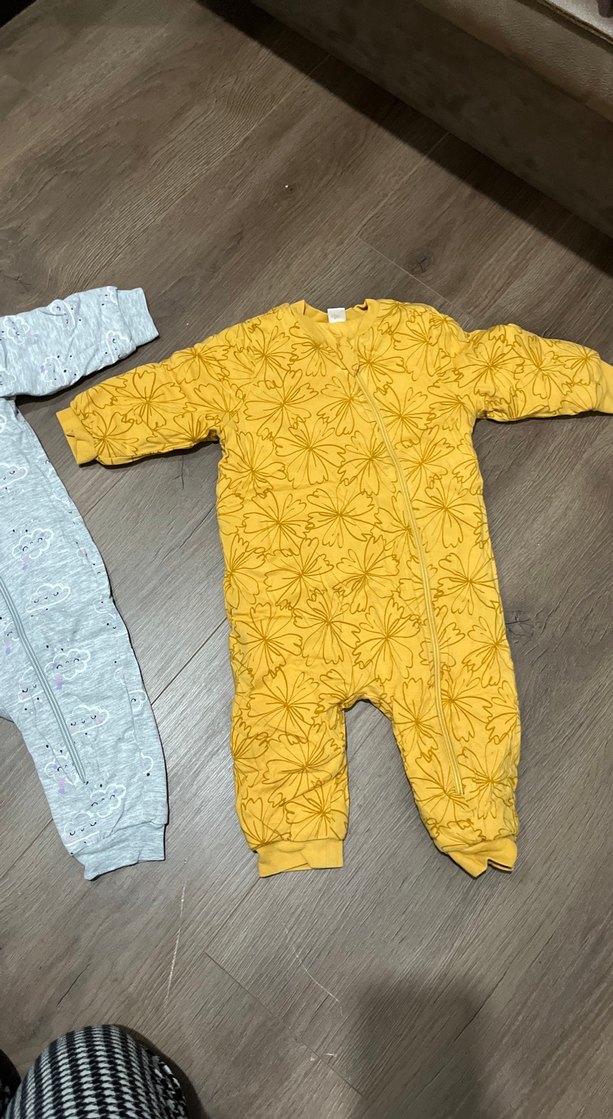 Sarı renkte, çiçek desenli, yumuşak ve sıcak dokulu bebek uyku tulumu.