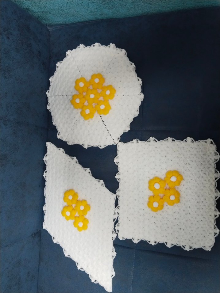 Beyaz el örgüsü lif seti, sarı çiçek desenleriyle süslenmiş, yuvarlak ve kare şekillerde, geleneksel tarzda hazırlanmıştır.