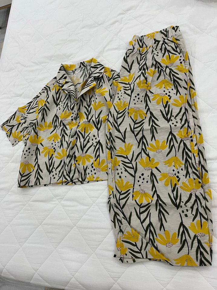 Kadın pijama takımı, kısa kollu ve bol kesimdir. Sarı çiçek desenli, gri zemin üzerine bohem tarzda tasarlanmıştır.