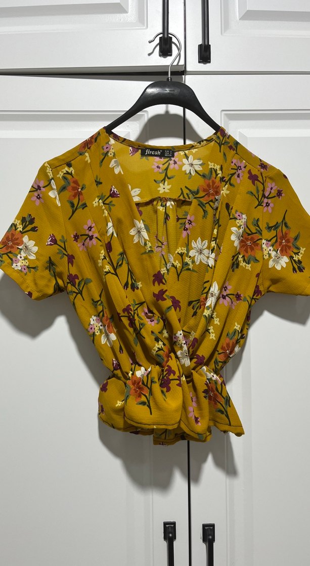 Sarı çiçek desenli kısa kollu, V yaka, bol ve drapeli bohem tarzda bluz. Kısa boyu ve yumuşak sentetik kumaşıyla rahat bir kullanım sunar. Sıfır