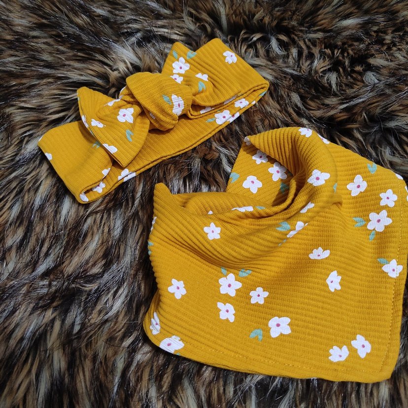 Sarı renkte, renkli çiçek desenli bandana ve fular . marka temsili .