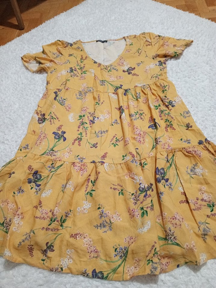 Sarı midi elbise, bol kesim, kısa kollu, çiçek desenli ve fırfır detaylı. V yaka ve yumuşak sentetik kumaştan, günlük kullanım için uygundur.