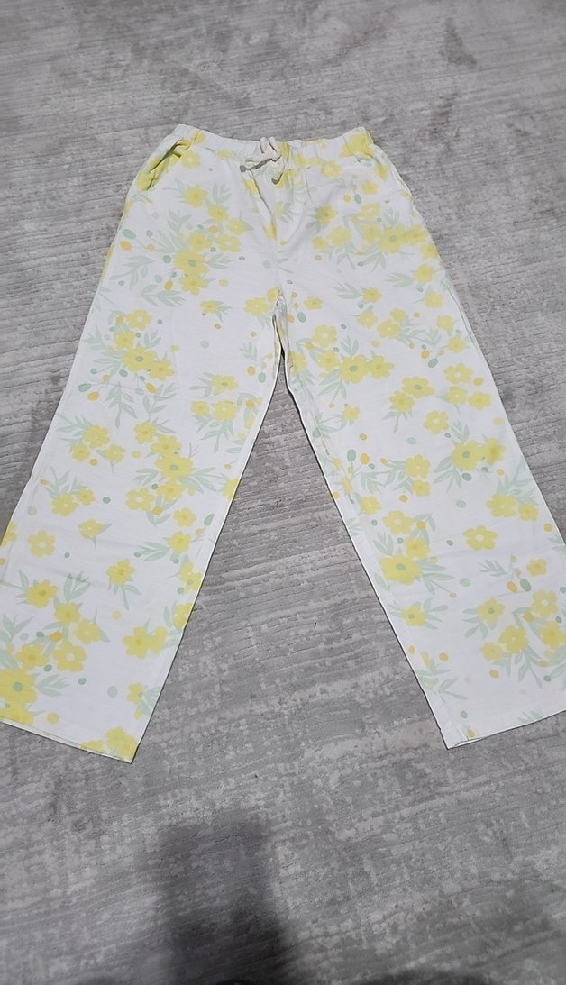 Yumuşak sentetik kumaştan yapılmış, sarı pastel çiçek desenli, bol kesim kız pantolonu.