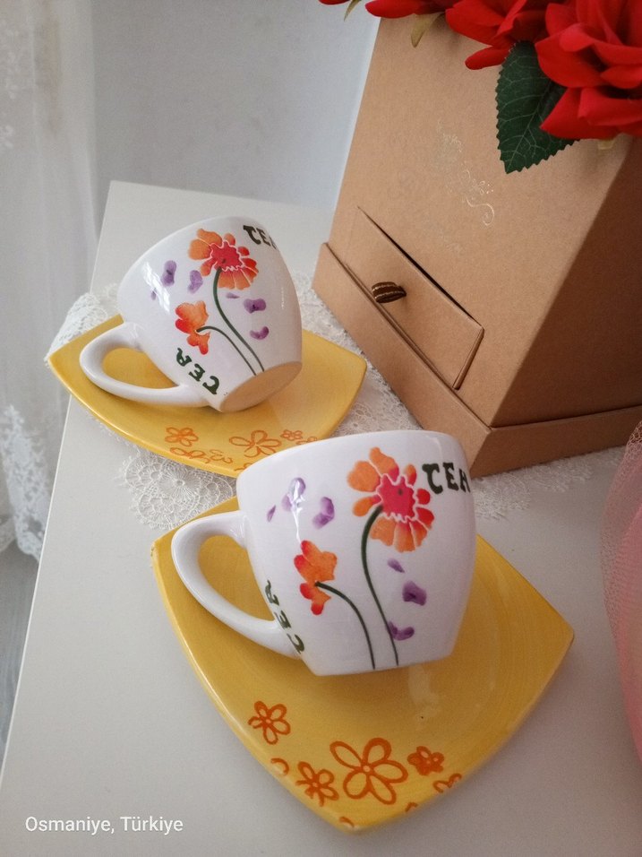 Çiçek desenli beyaz fincanlar, sarı çiçekli tabaklarla tamamlanmıştır. "TE" yazılı fincanlar Osmaniye, Türkiye'den gelmektedir.