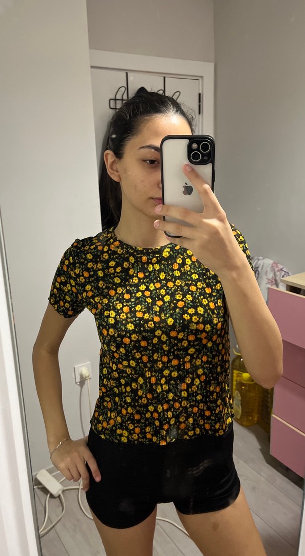 Sarı çiçek desenli, kısa kollu, yuvarlak yaka ve vücuda oturan crop top, rahat sentetik kumaştan üretilmiştir.