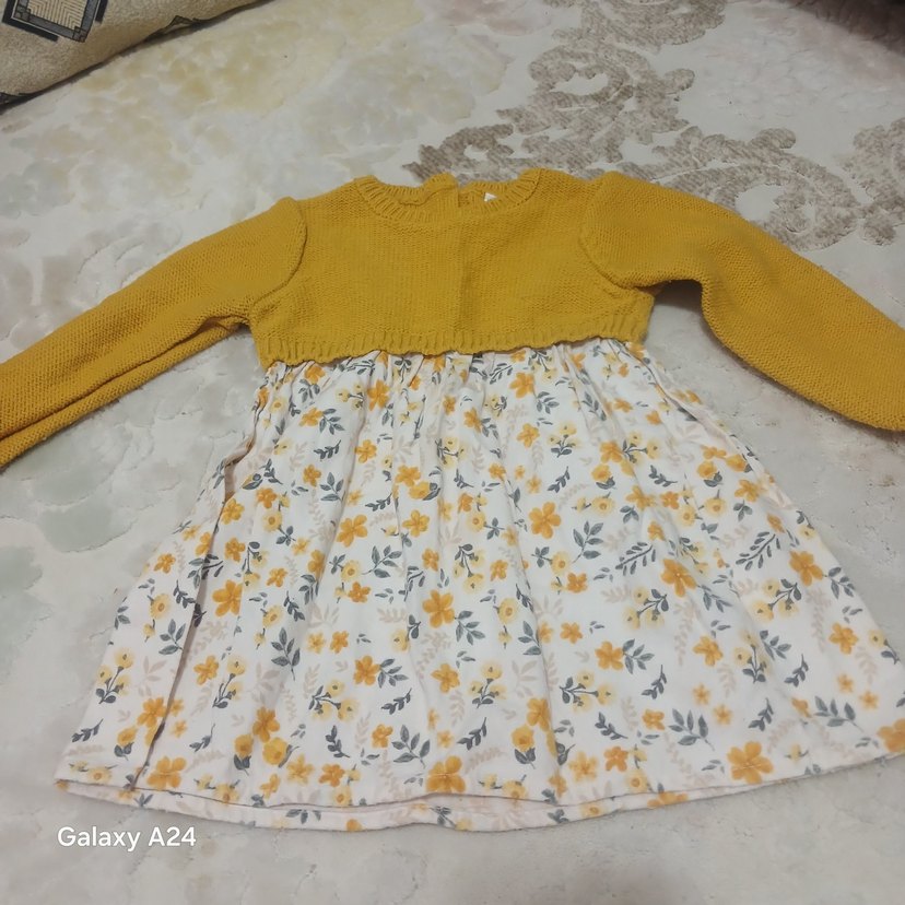 Sarı triko üst kısmı uzun kollu ve bol kesim olan kız çocuk elbisesi, çiçek desenli yumuşak kumaş etekle tamamlanmıştır.