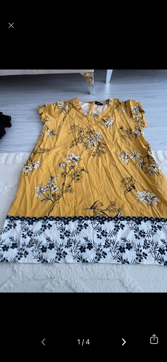 Sarı renkli, bol kesim bohem elbise. Kısa kollu, V yakalı ve çiçek desenlidir. Etek kısmında fırfır detay vardır, günlük kullanıma uygundur.
