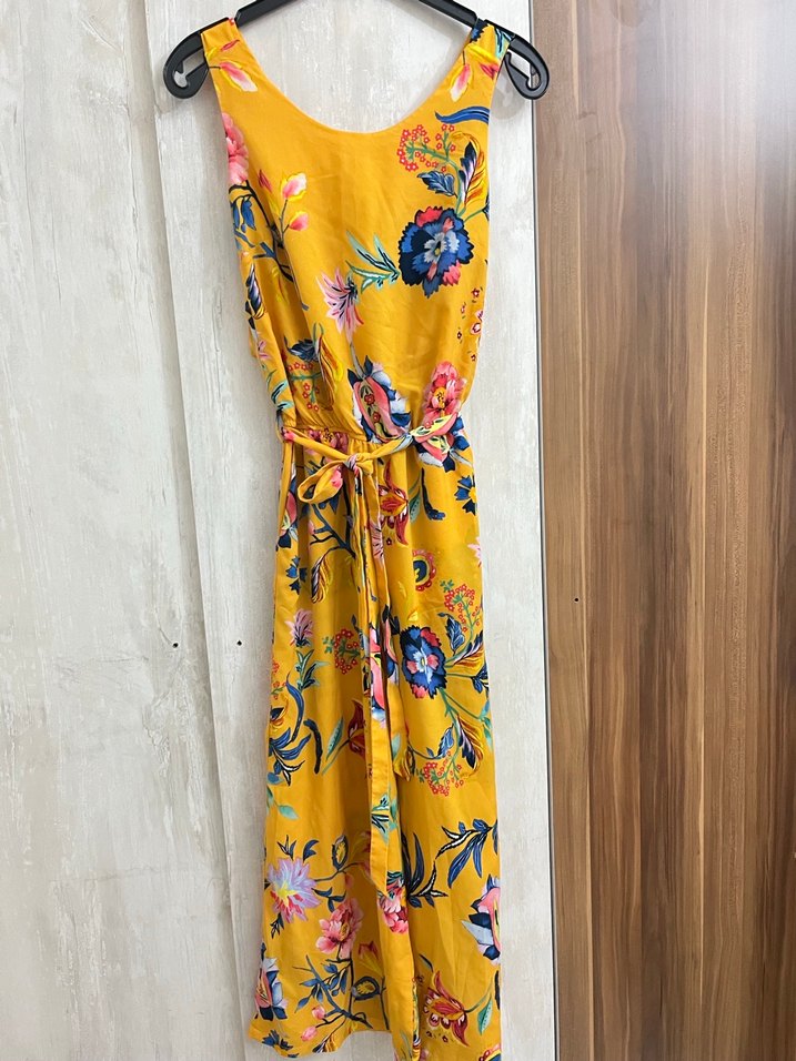 Sarı renkli, çiçek desenli bohem Tulum , bilek üstü, askısız yakaya ve kemerli bol kesime sahiptir.