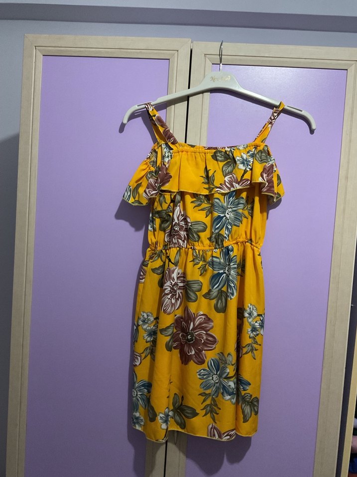 Sarı renkli, çiçek desenli mini bohem elbise, askılı ve volanlı detaylara sahip, rahat kesim ve yumuşak sentetik kumaştan yapılmıştır.
