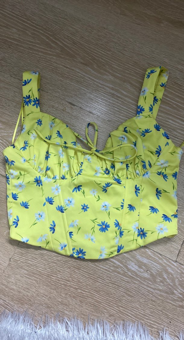 Sarı, çiçek desenli mini bustiyer, askılı ve düğmeli detaylara sahiptir. Bohem ve Paris tarzı, açık hava için uygundur.