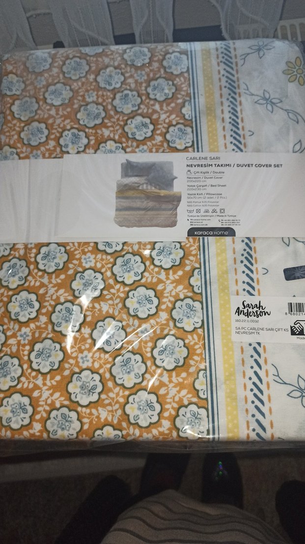 Bu sarı nevresim takımı, sarı zemin üzerinde beyaz ve mavi çiçek desenleri ile çizgili ve çiçekli detaylar içerir.