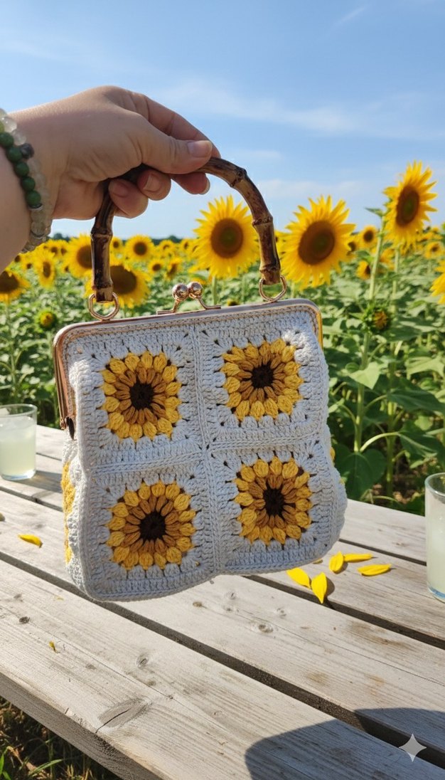 Ahşap saplı, sarı çiçek desenli örgü bohem kadın çantasıdır. Hafif ve yumuşak dokusuyla dış mekan kullanımı için uygundur.