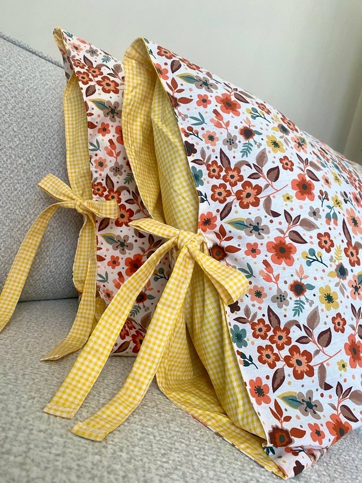 Yumuşak kumaştan, sarı kareli bağcıklarla renkli çiçek desenli yastık kılıfları.