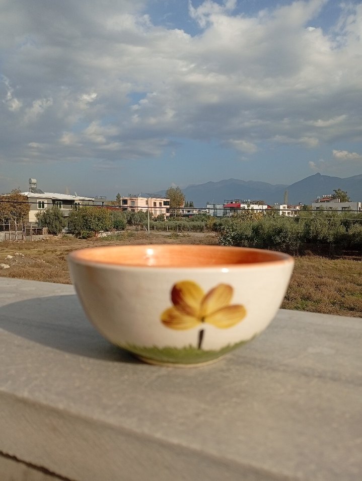 Seramik malzemeden üretilmiş, üzerinde açık sarı çiçek deseni bulunan, yuvarlak şekilli dekoratif vazo.