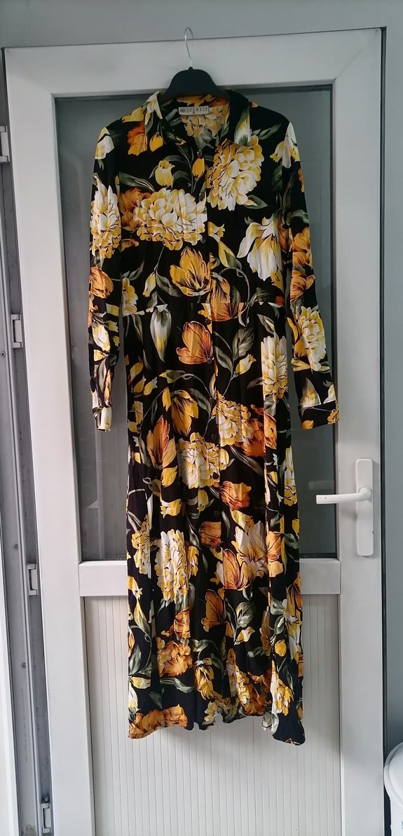 Sarı tonlarda çiçek desenli, uzun ve bol kesim bohem elbise. Uzun kollu, V yaka ve dökümlü yapıya sahip, sentetik kumaştan yapılmıştır.