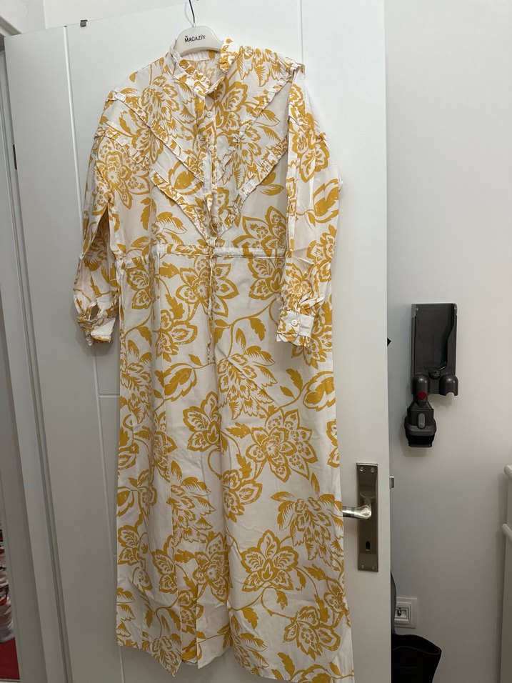 Sarı çiçek desenli, bol kesim, uzun kollu, düğmeli ve V yakalı bohem tarzı uzun elbise. Tekstil kumaştan üretilmiştir. s-m beden uyumludur