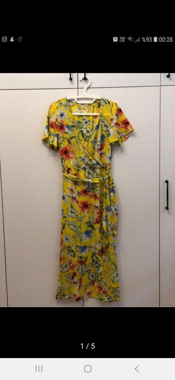 Sarı uzun elbise, V yaka ve kısa kollu, bol kesimlidir. Renkli çiçek desenli, dökümlü ve sentetik kumaştandır. Bohem tarz için uygundur.